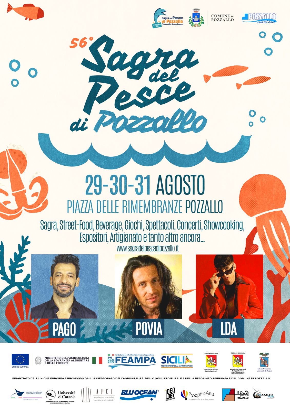 La 56ª Sagra del Pesce di Pozzallo è pronta a tornare con tre serate piene di gusto, tradizione e mare nel piatto. Ospiti d’onore: 🔹 Ven 29 - PAGO 🔹 Sab 30 - POVIA 🔹 Dom 31 - LDA - Piazza della Rimembranza