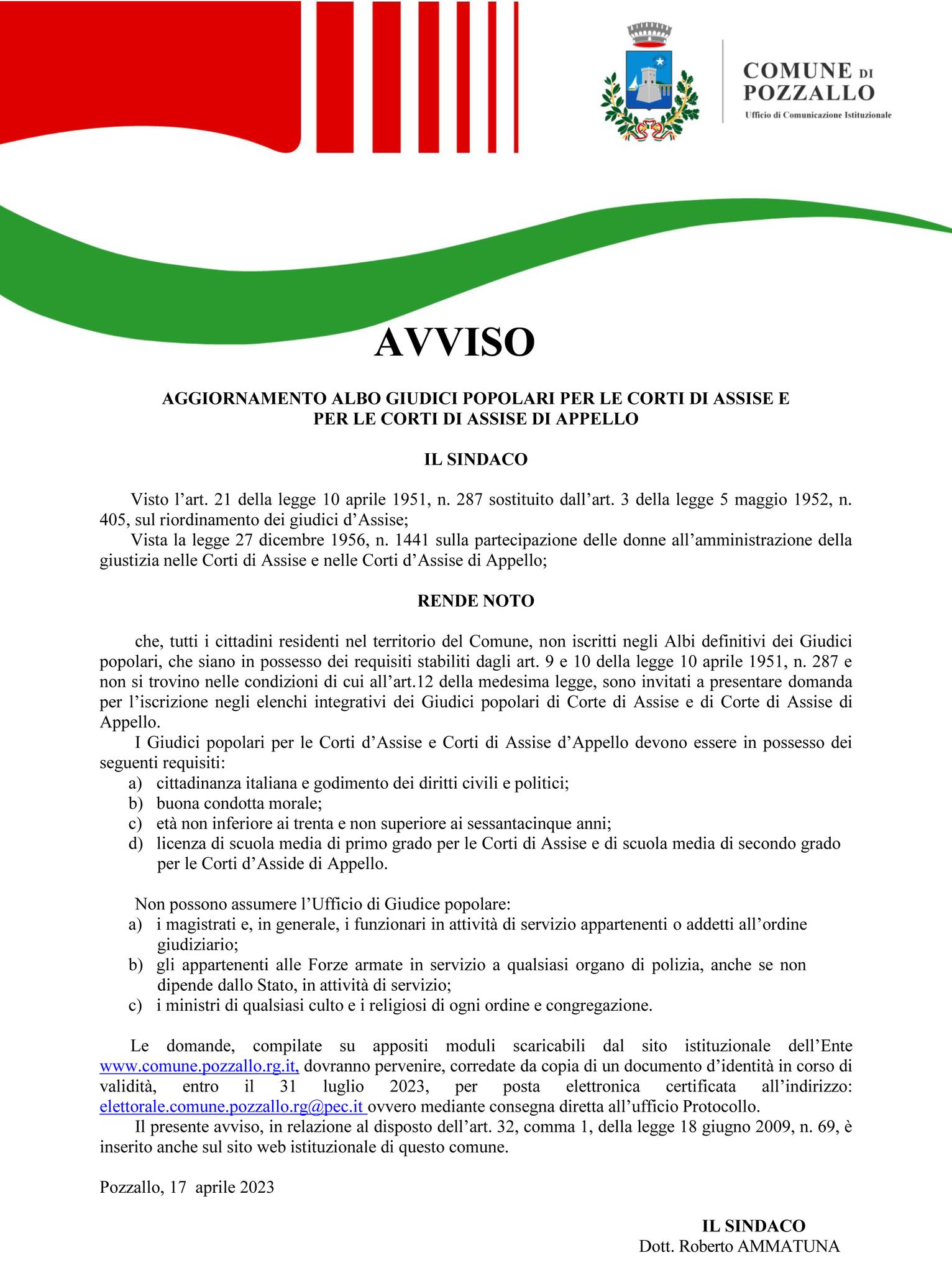 Aggiornamento albo Giudici Popolari per le Corti di Assise e per le Corti di Assise di Appello